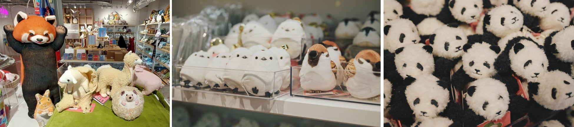 正面入り口で目を引くのが、窓ぎわいっぱいに積み重なる動物たち。店内に入ってパネルの丸抜きから顔をのぞかせると、もふもふの動物に包まれるという妄想が叶う写真を撮ることができます。