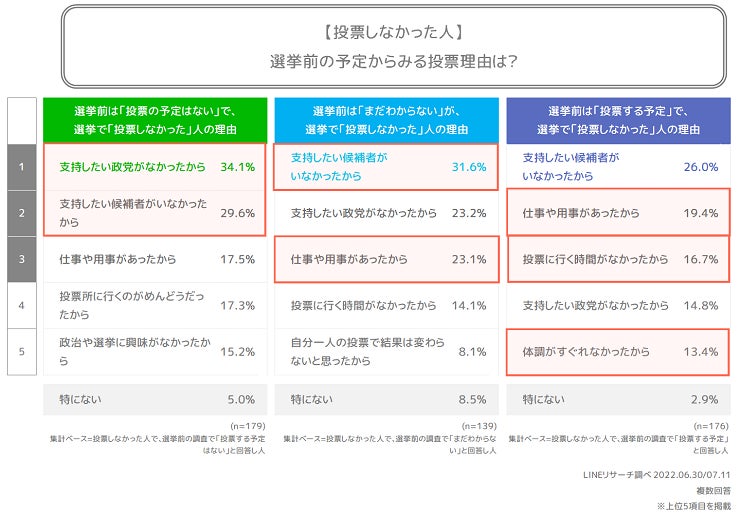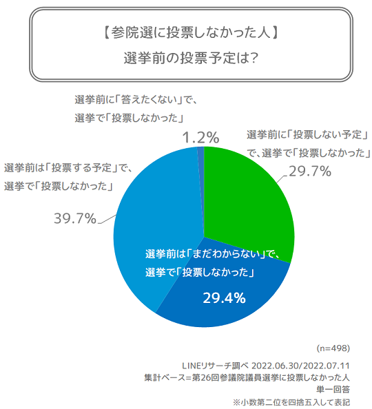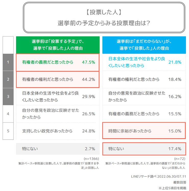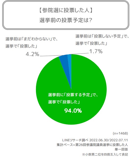 【LINEリサーチ】参院選事前事後の調査を実施、投票した人の9割が選挙前調査でも「投票する」、一方で投票しなかった人の4割が選挙前調査で「投票する」と回答