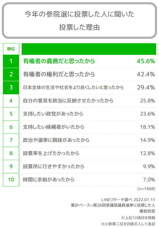 このたびLINEリサーチでは、日本全国の男女を対象に、今年の参院選に投票した人の割合やその理由などについて調査しましたので、結果をお知らせいたします。