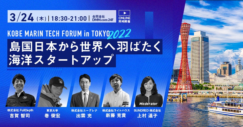 合同会社DMM.com(本社:東京都港区、会長兼 CEO 亀山敬司、https://dmm-corp.com/ 以下DMM)は、地方創生事業において、神戸市とともに「KOBEマリンテックフォーラム in TOKYO 2022」を2022年3月24日(木)に東京及びオンラインにて開催することをお知らせいたします。