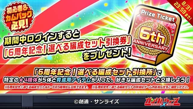 「LINE: ガンダム ウォーズ」の6周年を記念し、期間中に初回ログインで特定の機体5体の編成セットや育成用アイテム、選べるMAチケット等をプレゼントいたします。即戦力の編成ですので、これから「LINE: ガンダム ウォーズ」をプレイする方にもおすすめです。