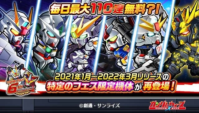 「LINE: ガンダム ウォーズ」の6周年を記念した無料ガシャキャンペーン「6周年記念!毎日最大110連無料?!メダルガシャフェスティバル」を開催いたします。期間中、毎日無料ガシャを引くことができ、一日の無料ガシャ回数は11~110連とランダムで変わります。さらに、11連10回目でフェス限定機体が確定で登場!この機会をお見逃しなく!