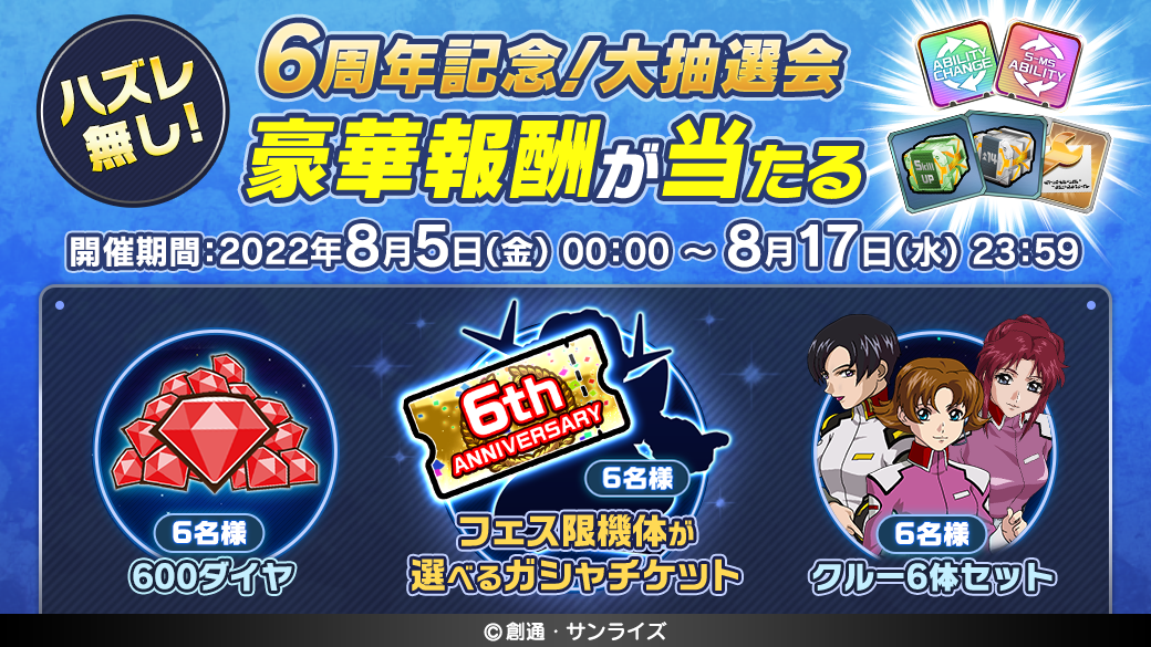 ユーザーアンケートで選ばれた機体をピックアップした「6周年記念!ユーザーアンケート 無料ガシャフェスティバル」を開催いたします。ピックアップ機体や無料ガシャの実施期間は8/5(金)に6周年特設サイトにて発表いたします。