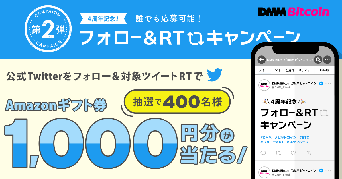 4周年を迎え、皆様に日頃の感謝の気持ちを込めまして、現在開催中の「おかげさまで4周年!DMM Bitcoinが進化する!6カ月連続キャンペーン」の第2弾のキャンペーンとして「4周年記念!フォロー&RTキャンペーン」を実施することをお知らせいたします。