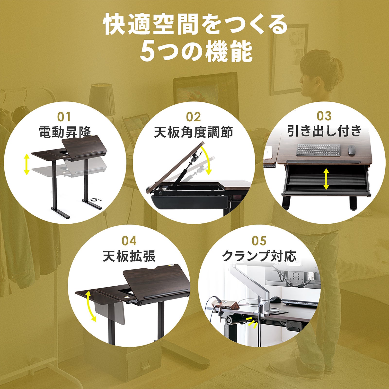 電動昇降デスク 引き出し付き 天板角度調節機能付き 天板拡張機能付き 座りすぎ防止 高さメモリー付