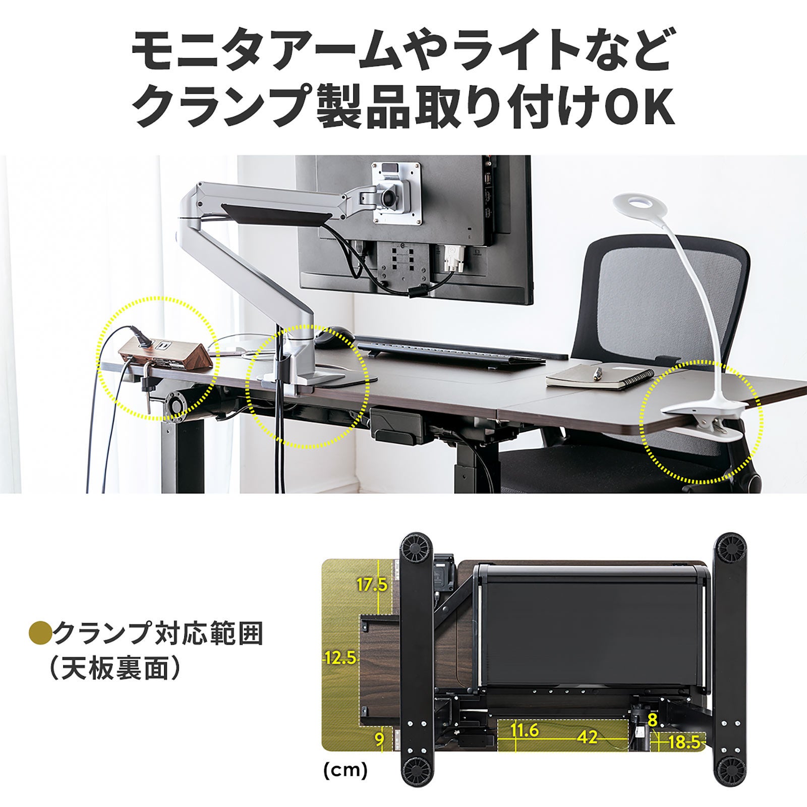クランプ固定のモニタアームやキーボードスライダーの取り付けが可能です。