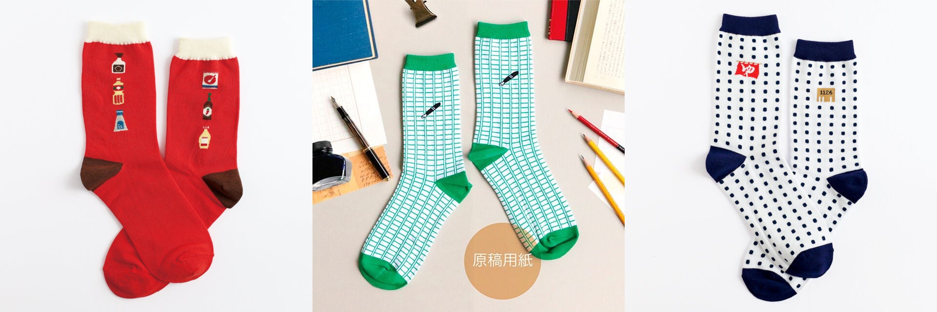 昭和を感じる身近なものがデザインに落とし込まれたキャッチ―で個性あふれる柄のソックスです。家庭でよく使われる調味料がデザインされた〈調味料〉、原稿用紙のマス目をそのまま模様に見立てた〈原稿用紙〉、レトロなてぬぐいの柄を連想させる〈銭湯〉など、シンプルコーデに遊び心をプラスしてくれるユニークなデザインが並びます。ほかにも理髪店のサインポールが大胆にデザインされた〈Barber〉や、昔懐かしい昭和のゲームがモチーフの〈Game〉など、昭和のレトロな雰囲気を楽しめる靴下が足もとを楽しく華やかに彩ります。