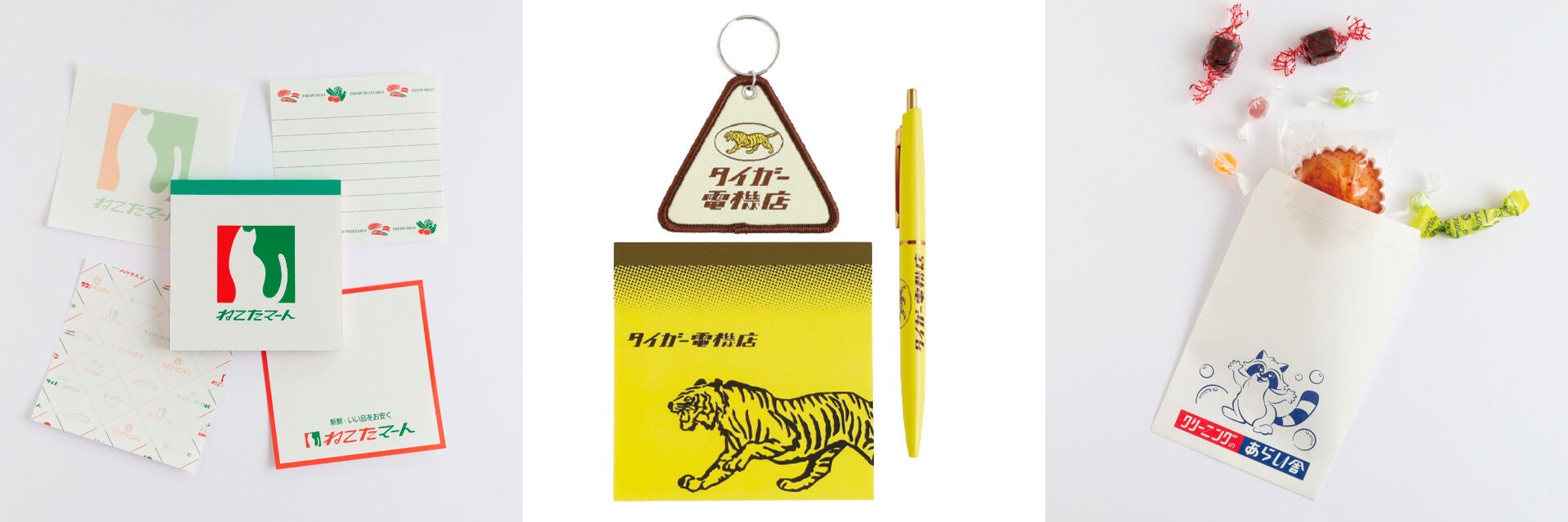 〈ねこたマート〉〈タイガー電機店〉〈あらい舎〉のどこか懐かしさを感じる3つの昭和風ロゴがあしらわれた「みんなにおすそ分けセット」と「ちょこっと筆記セット」。小さなギフトを包むのにぴったりなおすそ分け袋や、整理に便利な3ポケットファイル、デコに使えるマスキングテープとステッカーを詰め込んだ「おすそ分けセット」と、景品のような懐かしさ漂うメモパッドや書き心地抜群のボールペン、レトロなロゴがかわいいキーホルダーが入った「ちょこっと筆記セット」。どちらもどこか昭和を思い出す、心くすぐるアイテムたちです。