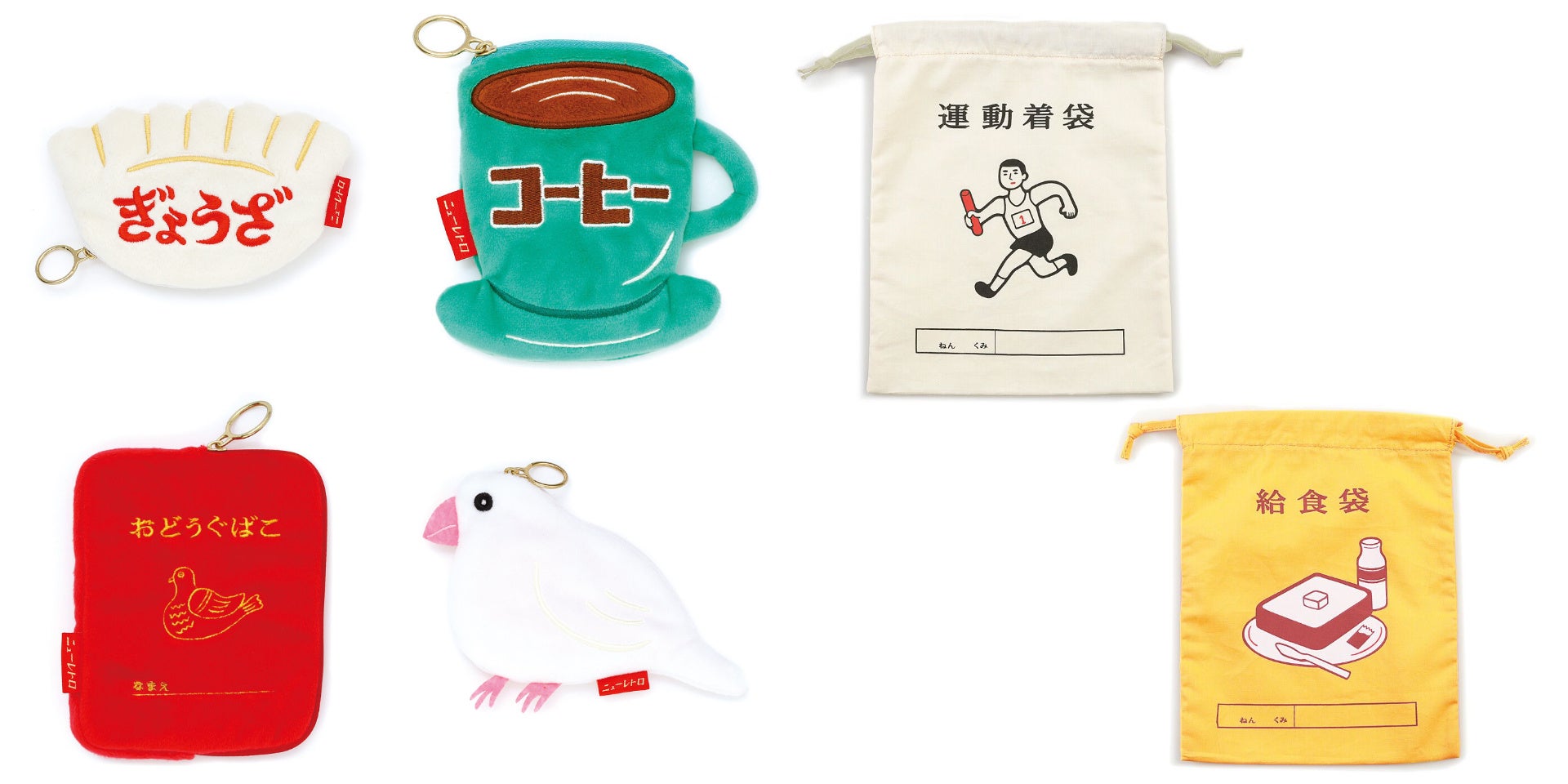 昭和レトロな雰囲気が漂うポーチと、テーマ別に2枚セットになった昔懐かしい巾着袋。文鳥やコーヒーなど個性豊かなダイカットポーチは、ふわふわ素材で小物収納にぴったり。きんちゃく袋は、運動着や給食袋を思わせる懐かしいデザインで、コスメやおやつなどを気軽に整理できます。どちらも日常使いはもちろん、ギフトにもおすすめのアイテムです。
