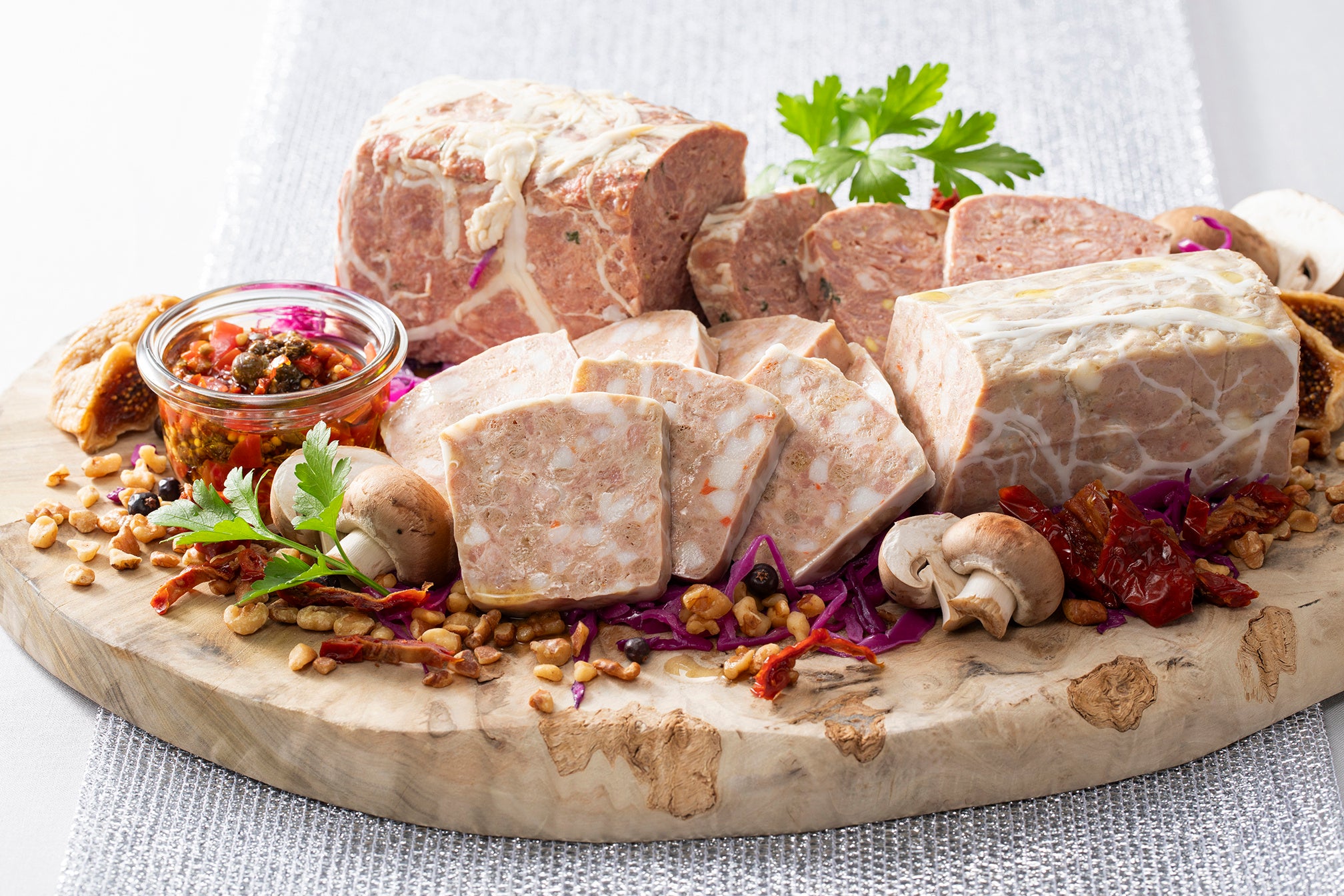 ラムとオリーブのテリーヌ クミンとニンニクの香りで仕上げて/★淡路牛とクルミのテリーヌ キノコのマリネを添えて/★グリルした天使のエビとムール貝 ゴーヤのソース