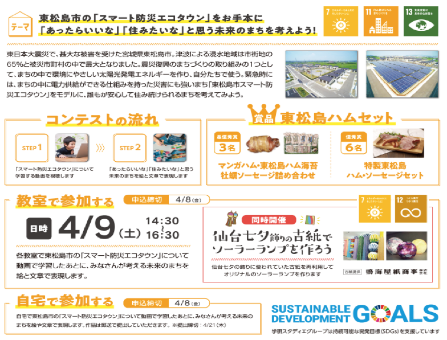 学研スタディエは、さいたま市SDGs認証企業にも、教育産業として唯一認証されており、ESD(持続可能な開発のための教育)に力を入れています。今回は、令和3年度 宮城県ストップ温暖化賞の大賞を受賞した、同社展開の宮城県のあすなろ学院との合同企画。宮城県東松島市と一般社団法人東松島みらいとし機構(HOPE)協力のもと、震災復興のまちづくりの取り組みの1つとして、まちの中で環境にやさしい太陽光発電エネルギーを作り、自分たちで使用し、域外停電時にもまちの中に電力供給ができる仕組みをもった、災害にも強いまち「東松島スマート防災エコタウン」を学び、誰もが安心して住み続けられるまちを考え、絵と文章で表現するイベントを開催します。一人でも多くの小学生に、持続可能な日本の未来について考えていただければ幸いです。