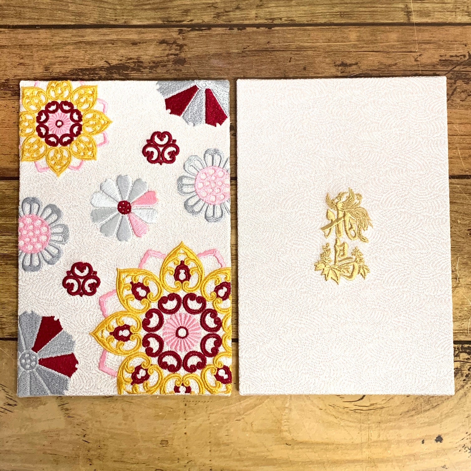 高松塚古墳とキトラ古墳から出土した飾り金具や、飛鳥寺の花組・星組の瓦の模様を表現した、高級感のある刺繍デザインの御朱印帳です。金色と銀色をベースに、清楚の中にも華やかさのある色合いに仕上げました。裏面には明日香村のグランドデザインである「飛鳥」を刺繍しています。