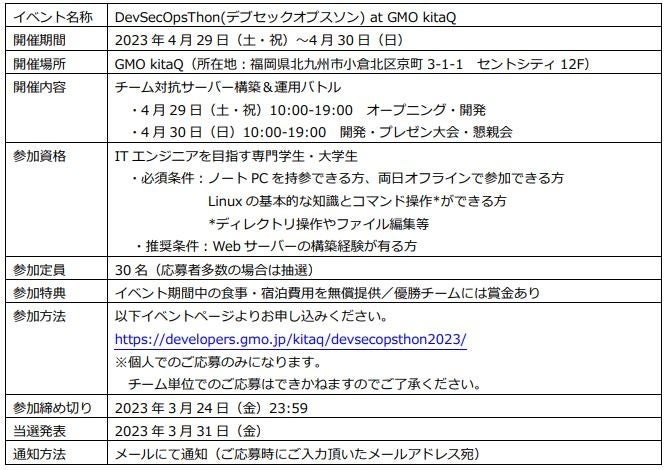 また、最も優秀な成績を収めたチームには賞金10万円が贈られます。企画内容の詳細は、イベントページ(URL: https://developers.gmo.jp/kitaq/devsecopsthon2023/)にて随時更新いたします。昨年の開催の様子を公開しておりますので、詳しくは開催レポート(URL: https://developers.gmo.jp/18309/)をご覧ください。