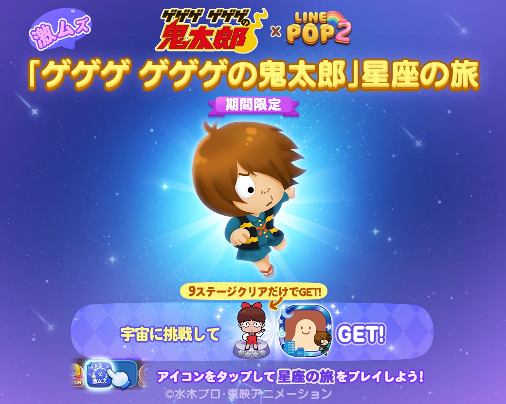 LINE株式会社(本社:東京都新宿区、代表取締役社長:出澤 剛)は、当社が展開する6角形パズルゲーム「LINE POP2」(iPhone・Android対応/無料)において、本日より『ゲゲゲ ゲゲゲの鬼太郎』とコラボレーションを開始したことを、お知らせいたします。