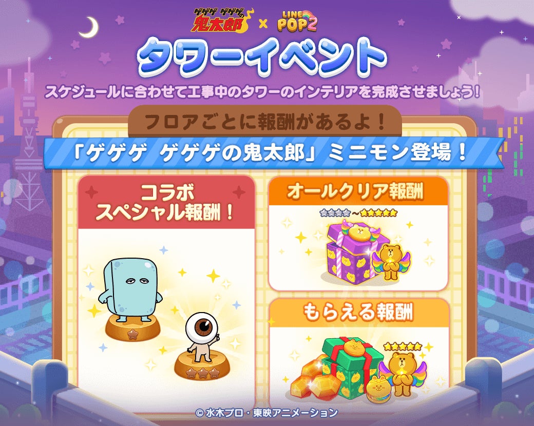 本コラボレーションを記念した期間限定のPOP2タワーが出現します。フロアごとに「★1 ぬりかべ(第3期)」や「★3 目玉おやじ(第3期)」など、さまざまな報酬が用意されていますのでぜひ挑戦してください。