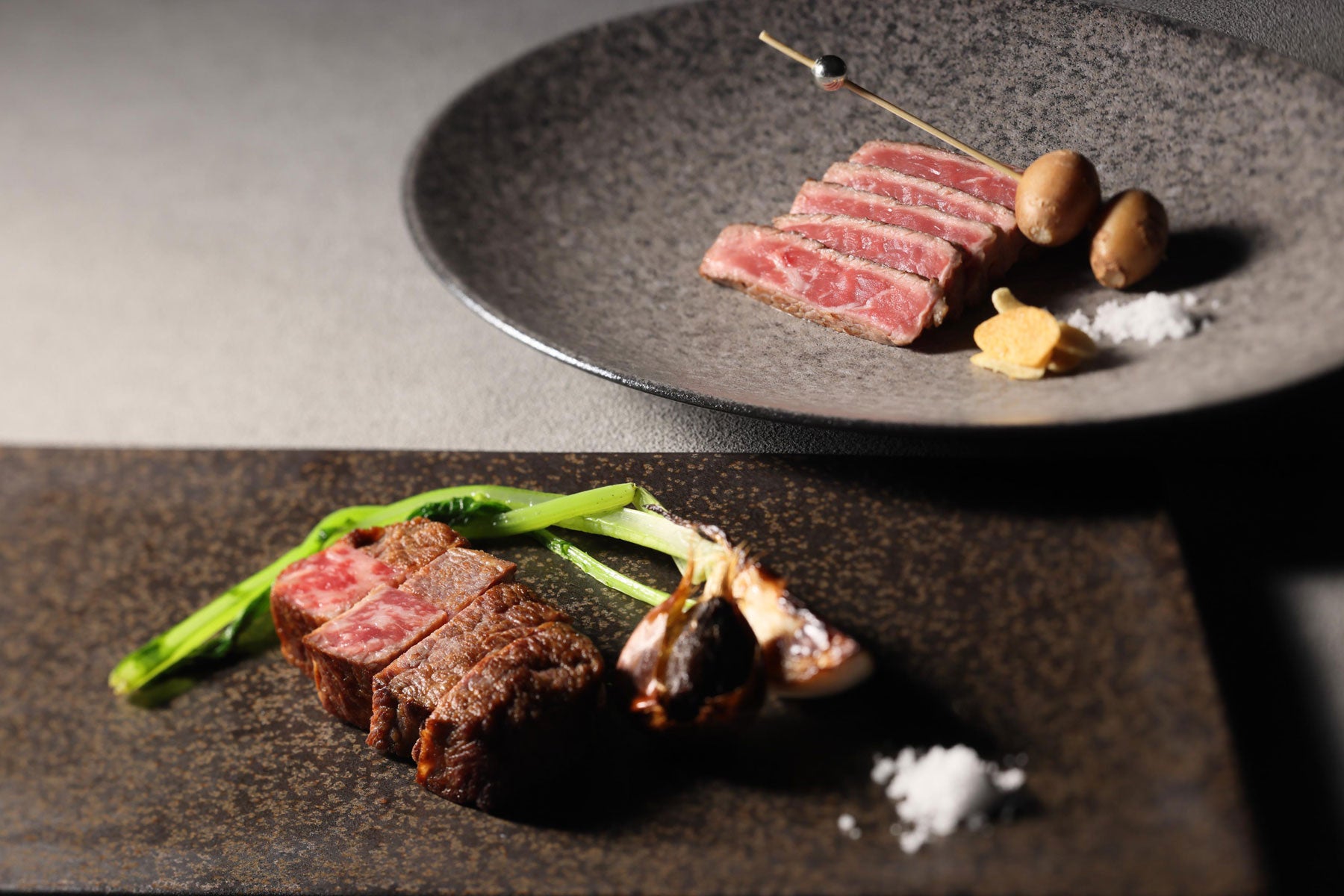 青森県産平目、青森シャモロック、あおもり倉石牛・八甲田牛のサーロインなど、選び抜かれた青森県産の食材を鉄板焼シェフが五感で楽しむコースへと昇華させました。「あおもり倉石牛と八甲田牛サーロインの食べ比べ」は、いずれも青森県の自然と匠の手によって大切に育まれた銘牛であり、とろけるような脂の甘みや赤身の旨味を堪能でき、その贅を極めた食べ比べはこの上ない口福をもたらします。食後を彩るのは、青森県の恵み・りんごとあおもりカシスを使用したひと皿。口いっぱいに広がる爽やかな酸味と豊かな香りが、コースの締めくくりにふさわしい余韻をもたらします。