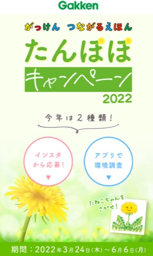 株式会社 学研ホールディングス(東京・品川/代表取締役 社長:宮原博昭)のグループ会社、株式会社 学研教育みらい(東京・品川/代表取締役社長 兼 COO:小林徹)は、3月24日〜6月6日に、インスタグラムを通じてたんぽぽの写真を募集する「たんぽぽはっけんキャンペーン」を展開します。