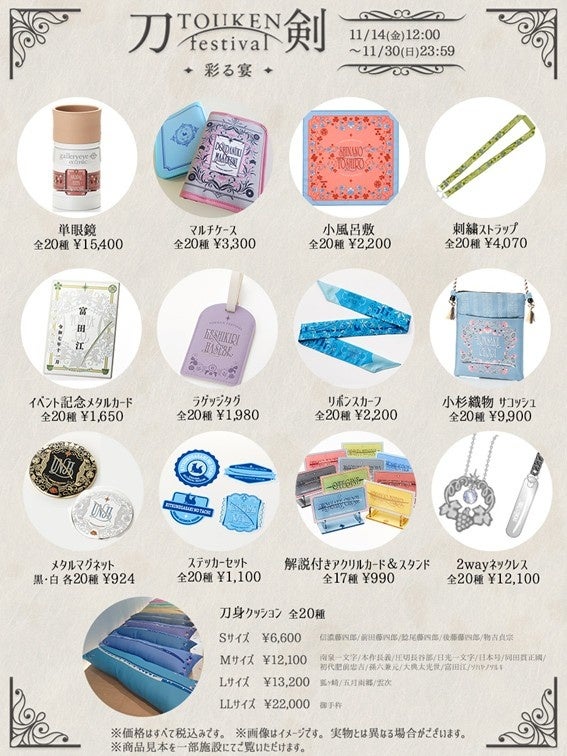 株式会社丸井(本社:東京都中野区、代表取締役社長:青野 真博)は、マルイのネット通販「マルイウェブチャネル」にて、20振りの刀剣をモチーフにしたグッズを販売するイベント「刀剣festival -彩る宴-」を実施いたします。丸井では、今回の「刀剣festival-彩る宴-」をはじめとし、一人ひとりの好きを応援するイベント展開を拡大しております。今後の展開にもご期待ください。