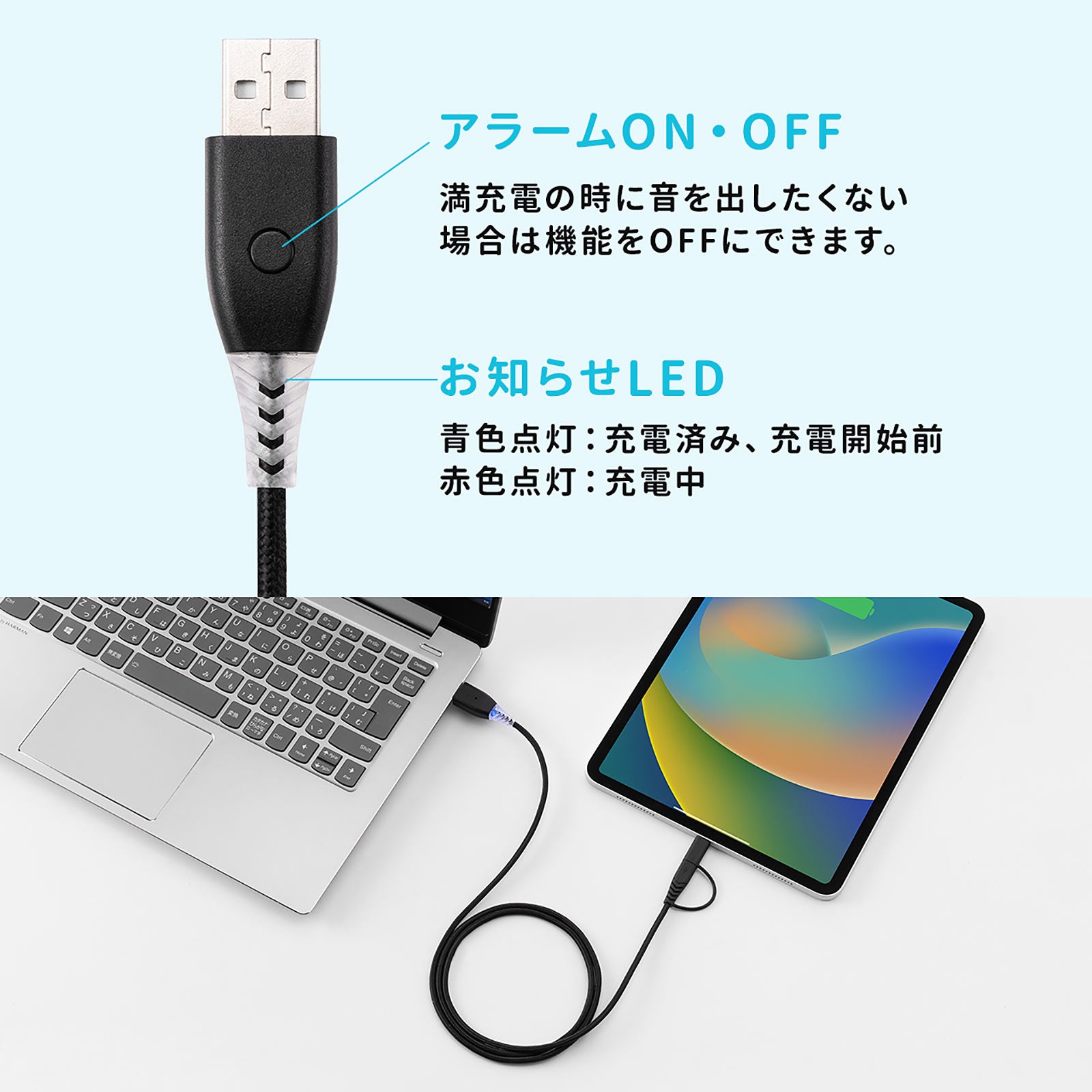 本製品は、音と光で充電状況が分かるUSBケーブルです。