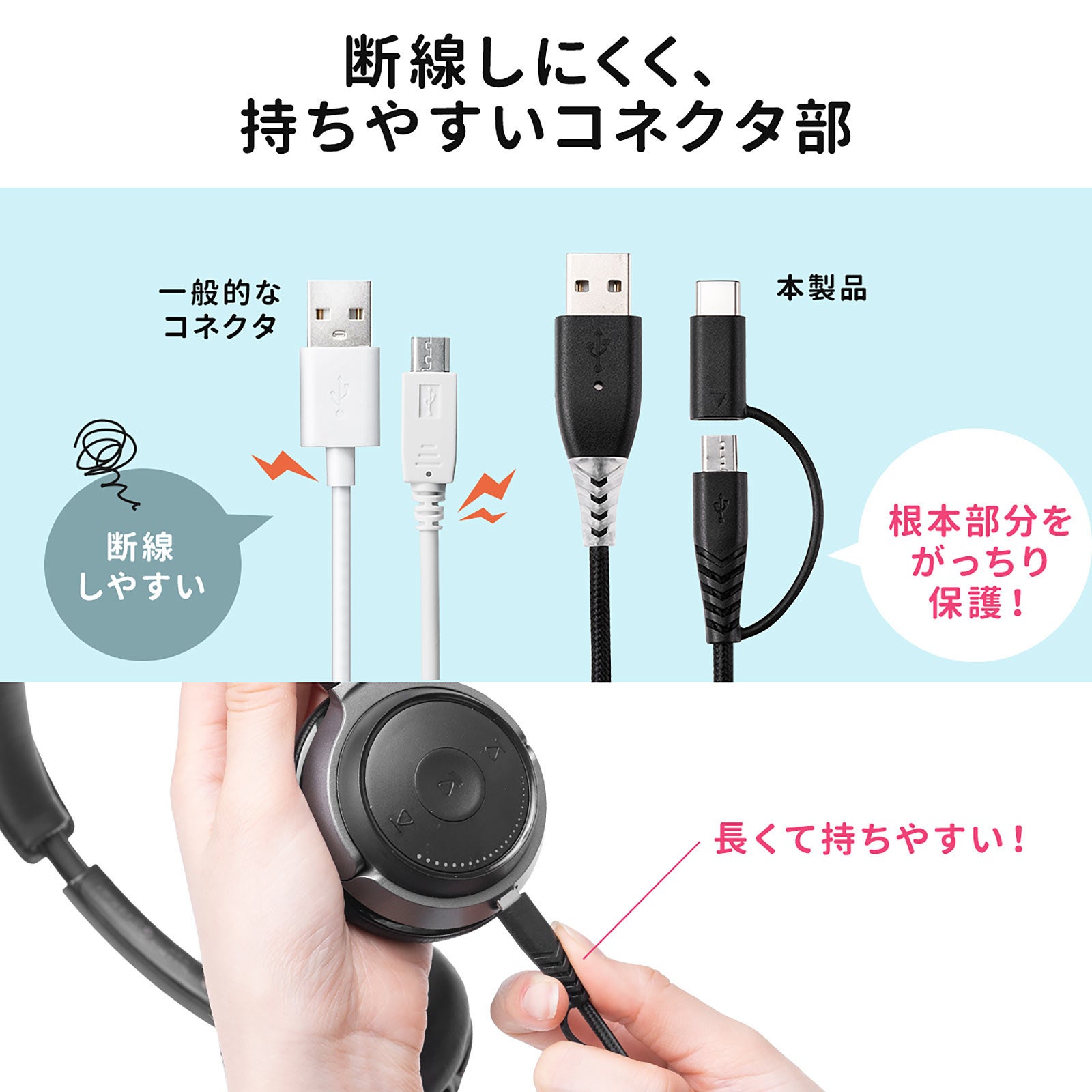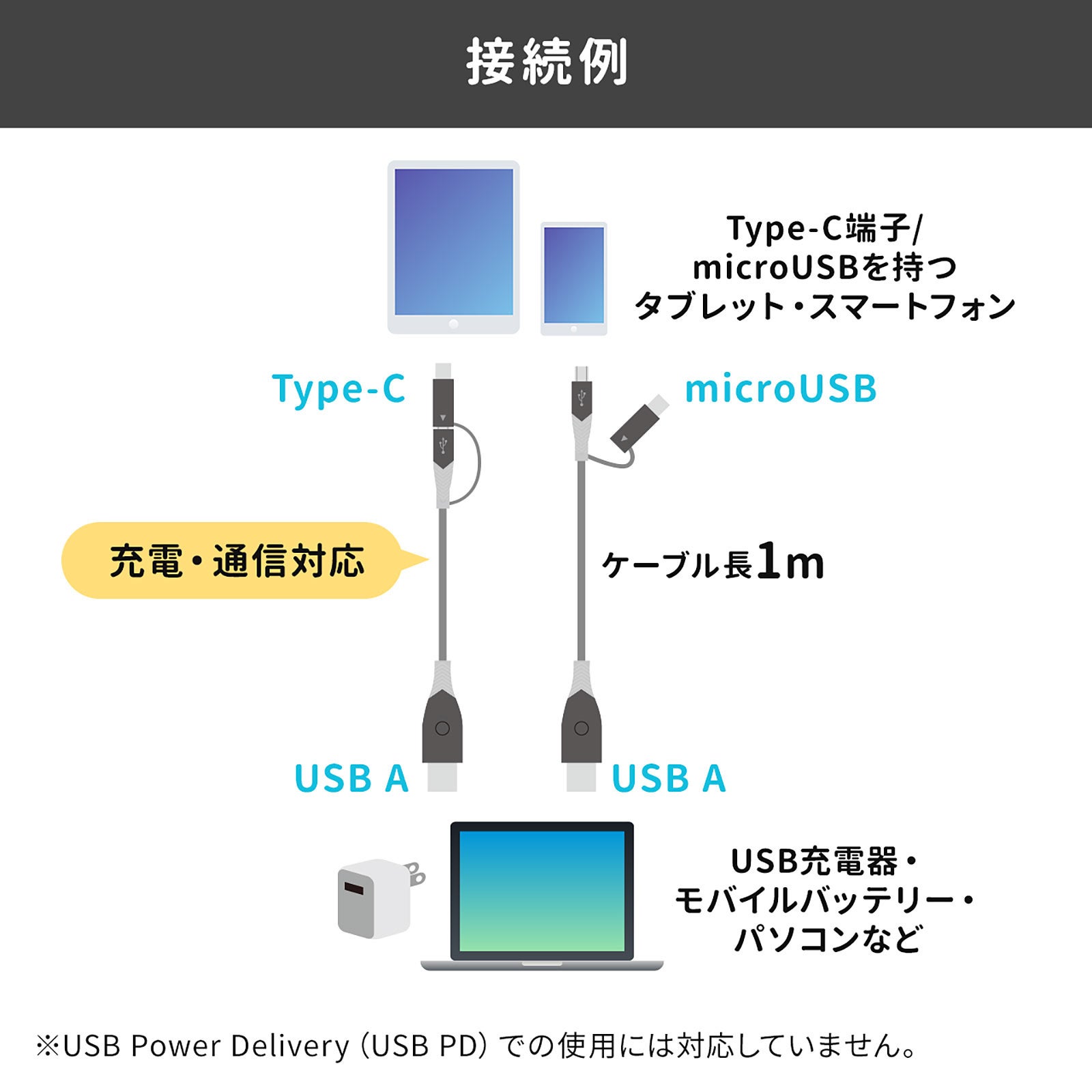 Type-Cの変換アダプタ付きで、Type-Cケーブル、microUSBケーブルとして使用できます。 ※変換アダプタを使用する際は、必ずmicroUSBに接続してご使用ください。