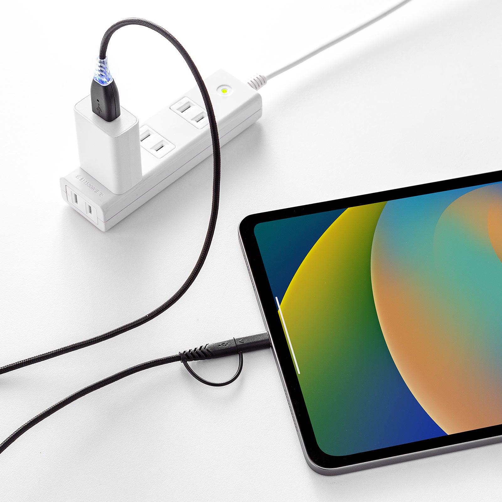 サンワサプライ株式会社(本社:岡山市北区田町1-10-1、 代表取締役社長 山田 和範)が運営している直販サイト『サンワダイレクト』では、音と光で充電状況が分かり、iPadやBluetoothイヤホンやモバイルバッテリーへの過充電を防ぐことができる、断線や引っ張りに強いメッシュ素材のUSB Type-C・microUSBの2種類のコネクタを選んで使える2in1ケーブル「500-USB069」を発売しました。