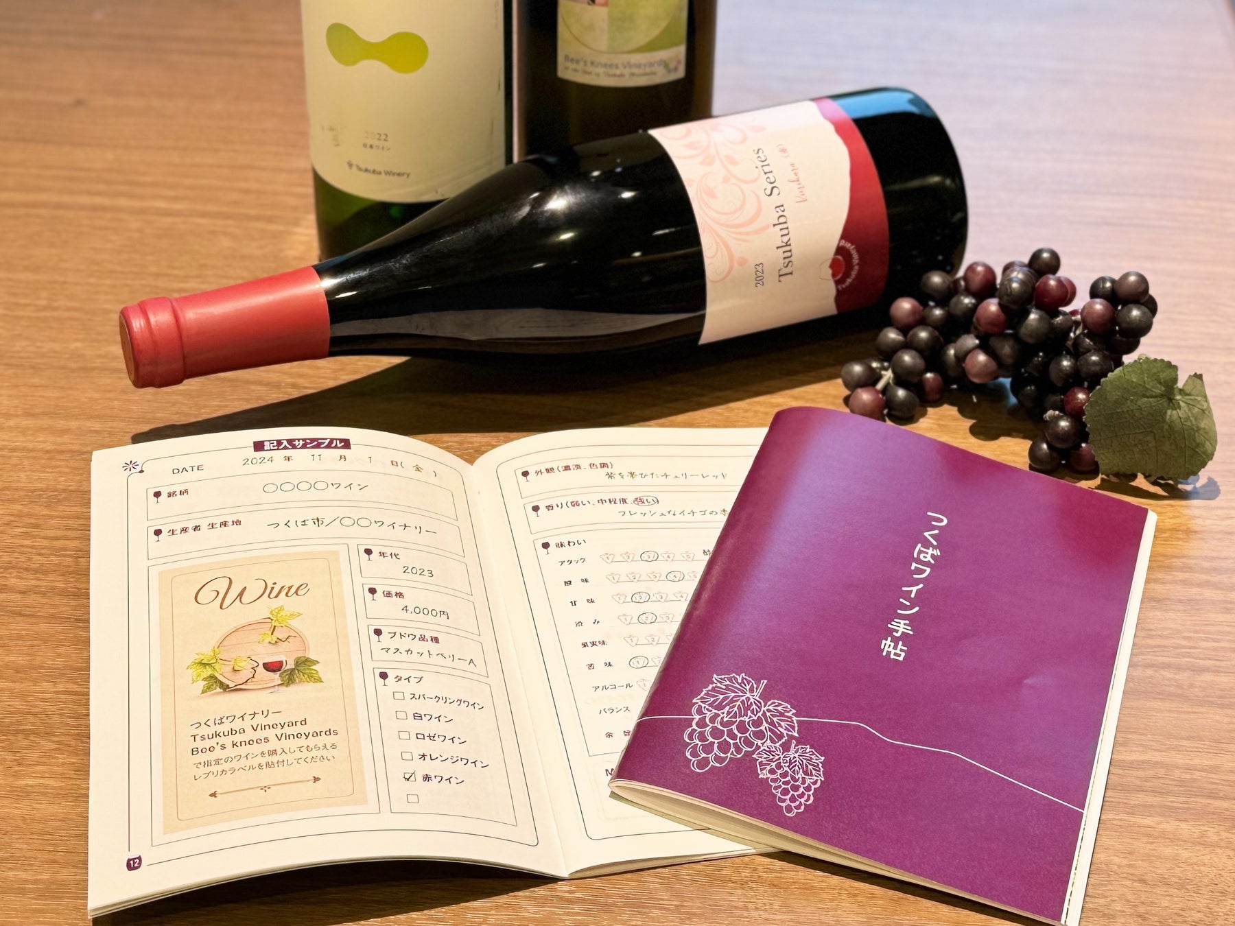 つくば市内3カ所のワイナリーのご紹介やワインの楽しみ方やテイスティングの手順、テイスティングメモページなど生産者のアドバイスとともにホテル日航つくばのシニアソムリエが監修した手帖です。テイスティングメモには、ワイナリーでワインを購入するともらえるエチケットのレプリカを貼り付けることができ、見た目や香り、味わいなどを記録できます。自分だけのオリジナルワイン手帖として活用いただけます。