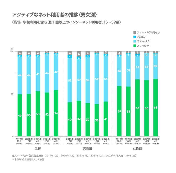 ・男女別では特に女性で「スマホのみ」の利用者の増加傾向がみられ、過去最多の68%となった。