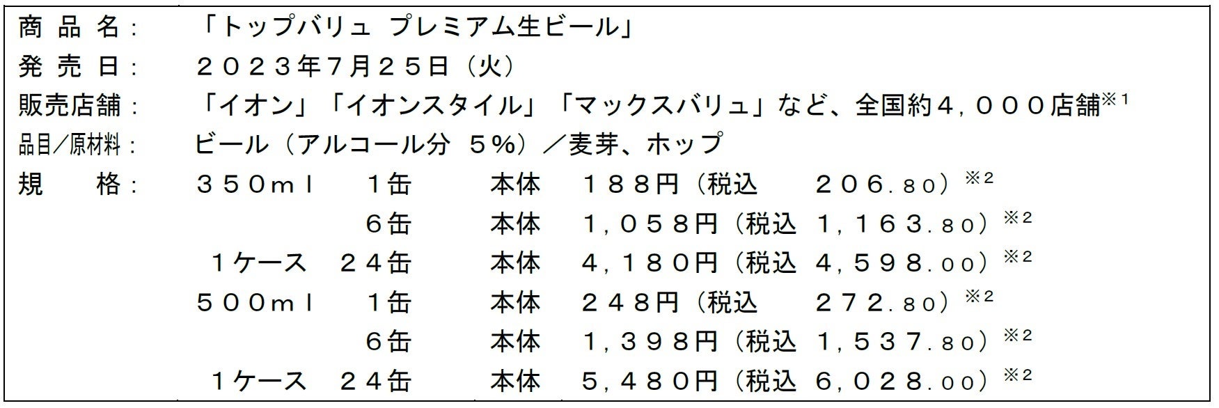 イオンは7月25日(火)、「イオン」「イオンスタイル」「マックスバリュ」など、全国約4,000※1店舗にて「トップバリュ プレミアム生ビール」を発売します。