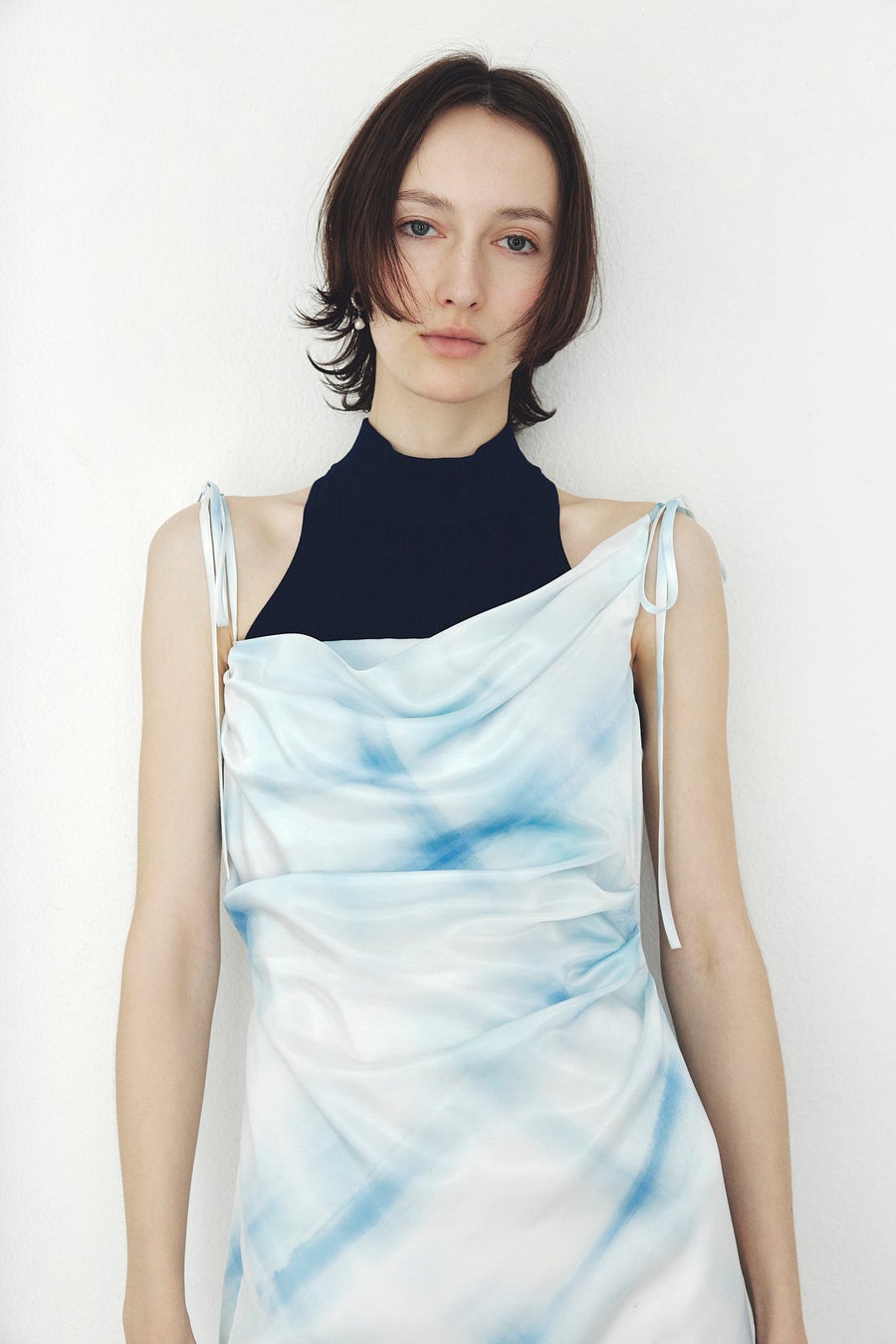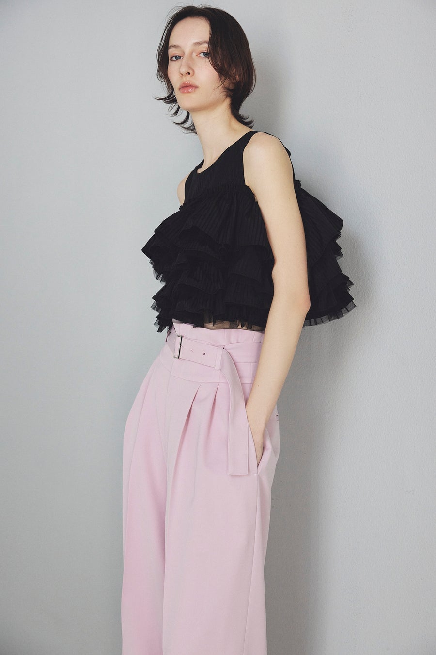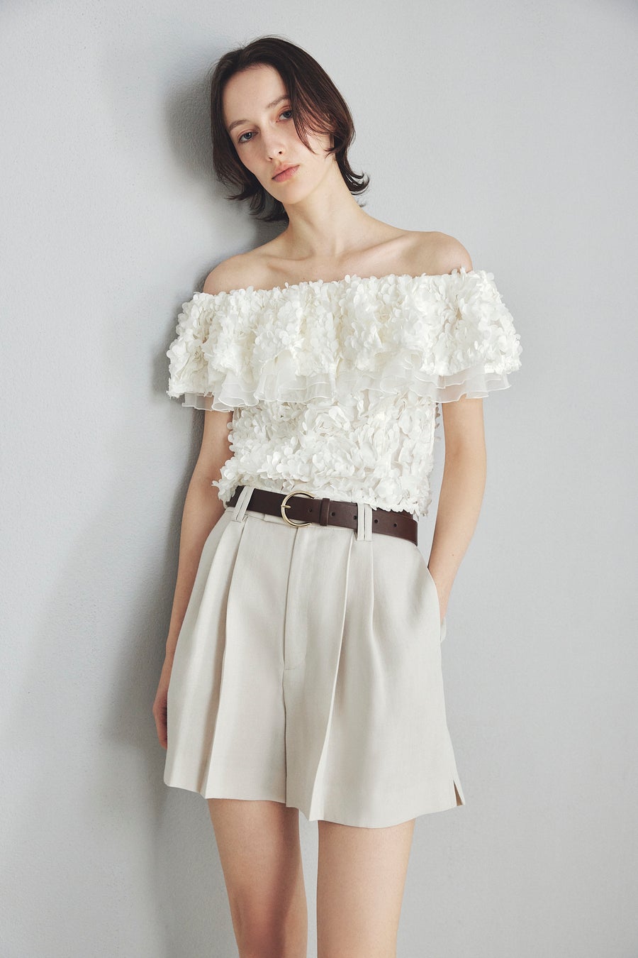 花びらから着想を得た折り重なるラッフルフリル、葉脈のように繊細なレースや、華やかなボタニカルプリント、シアー素材同士を重ねる事で生まれる奥行きと透明感が春の空気をまとうような軽やかさを演出。