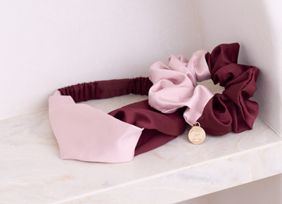 「ROSIER by Her lip to」を象徴するアースレッドと、「Her lip to BEAUTY」のモーヴのバイカラーが目を引く、オリジナルヘアバンドとシュシュ。
