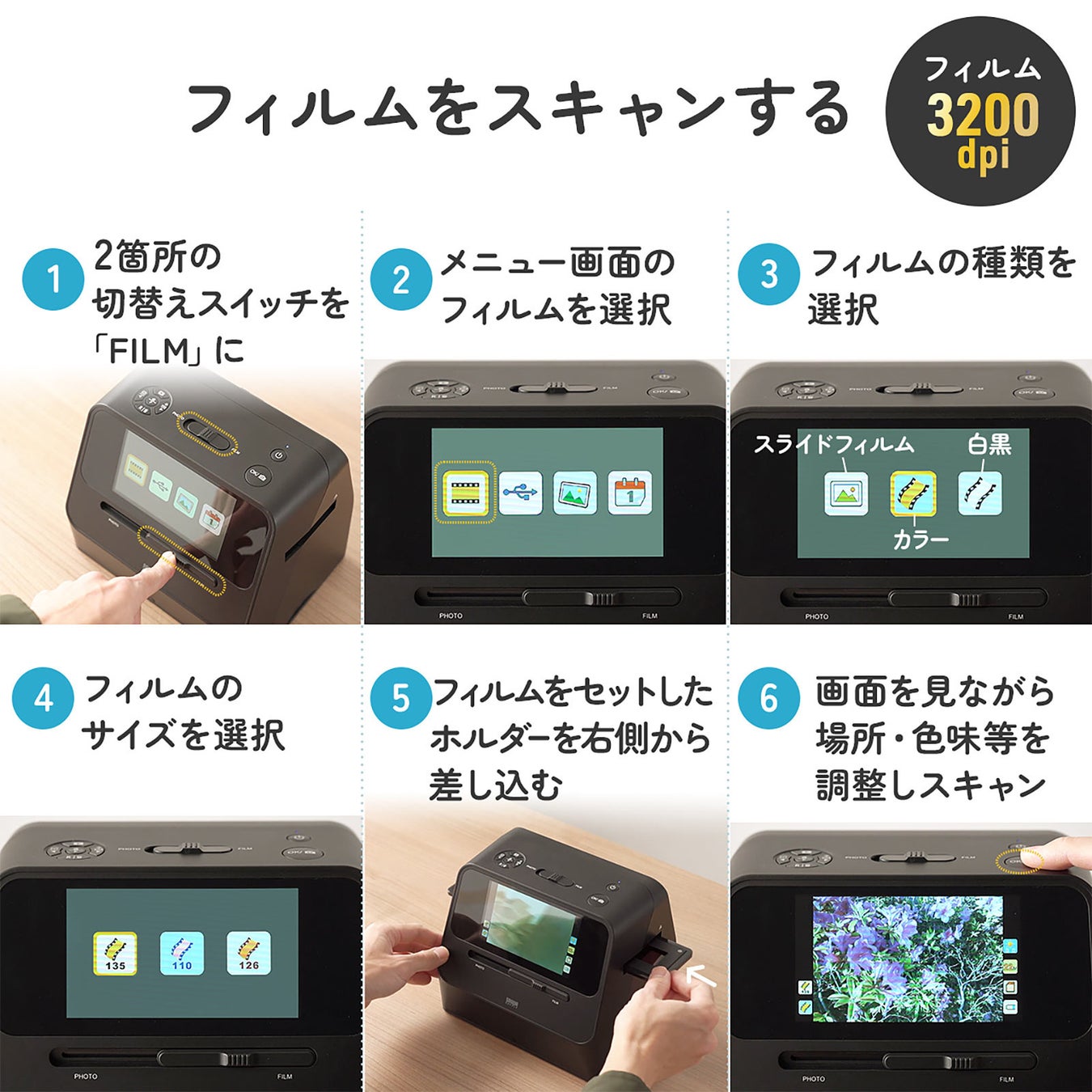 ネガフィルム、ポジフィルムをスキャンできるフィルムモード、写真などの紙媒体をスキャンできるフォトモードを搭載しており、フィルムモードでは、35mmフィルム(135フィルム)、110フィルム、126フィルム、スライドフィルム(マウント付き50×50mm)のスキャンに対応します。