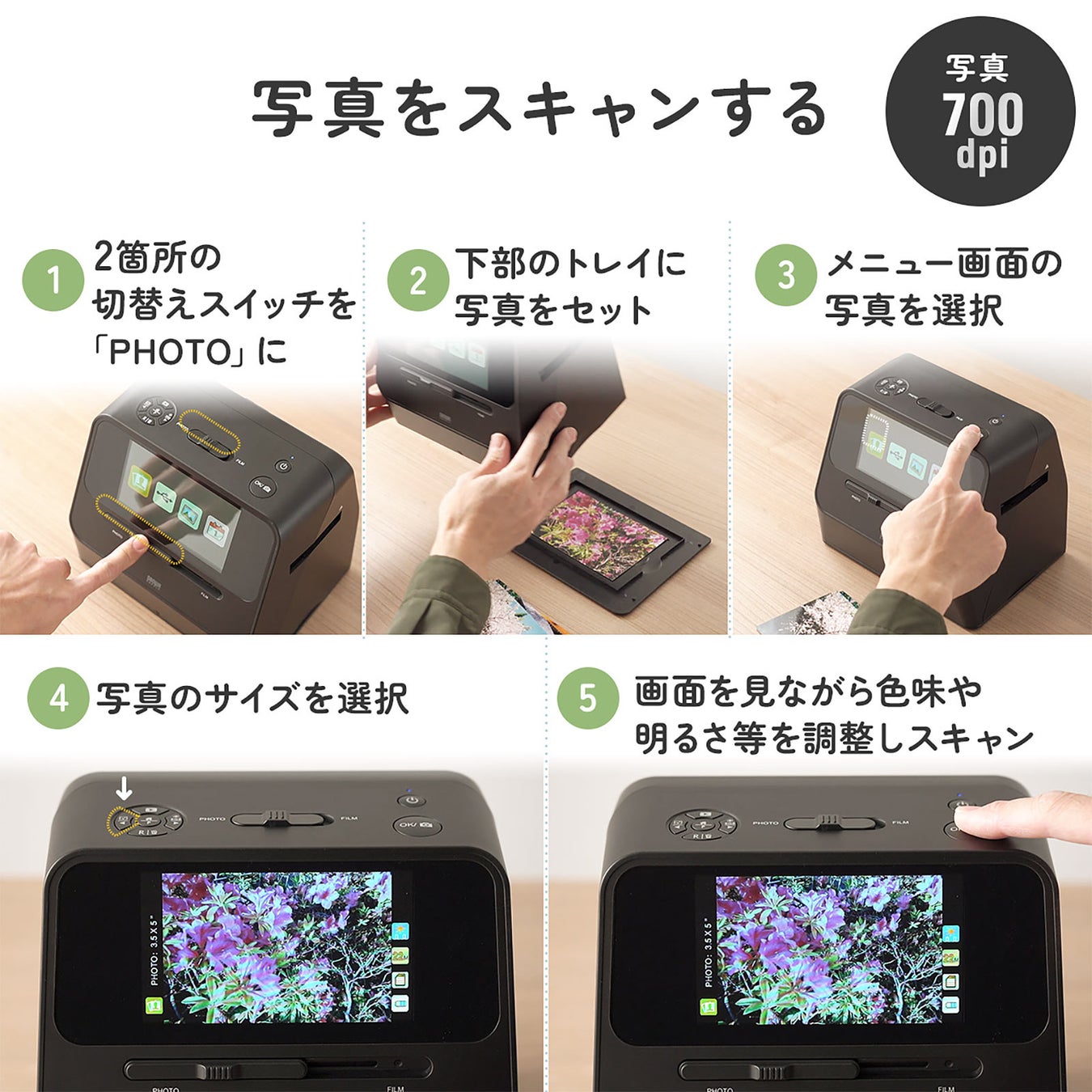SDカードに入っている画像をディスプレイ上で確認することもできます。フィルムモードは3200dpi、フォトモードは700dpiの高解像度でデータ化が行なえます。