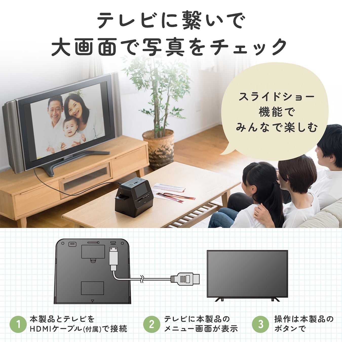 HDMI出力が可能で、テレビに映してスキャンや、スライドショーをテレビに映して皆で共有することができます。
