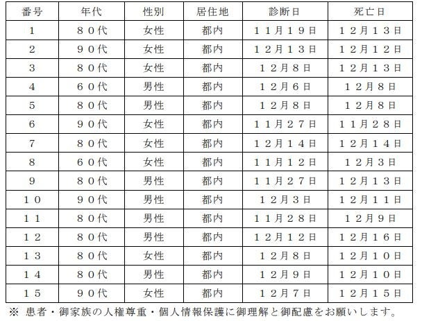 都内で新型コロナウイルスに感染した方が死亡されましたのでお知らせします。