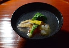 今回の期間だけ登場する復刻メニュー。アサリの出汁に、高知・宿毛産の真鯛のアラを静かに煮出して合わせ、澄み切った旨味を追求した一品