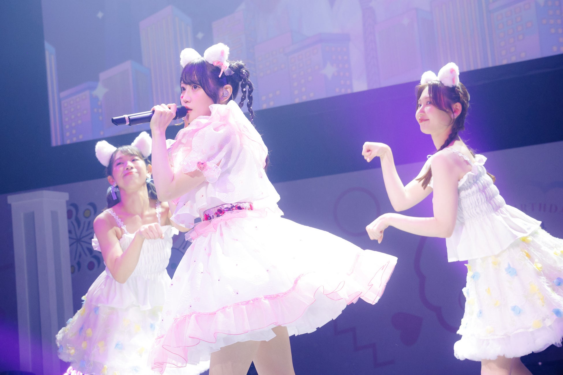 待望のライブコーナーでは、浴衣姿からピンクをあしらったキュートな歌衣装にチェンジ。「君色のキセキ」「I・LOVE・YOU!!」を立て続けに披露した後は、今回のイベントのテーマ“Day Cute ♡ mode”にあった曲として「ね〜え?」(松浦亜弥)と「最上級にかわいいの!」(超ときめき♡宣伝部)をカバー。ダンサー2人も加わって、会場をさらに盛り上げていく。そして、ラストスパートとばかりに、猫耳をつけてかわいさマシマシで「Wild☆Kitty」、「ハイタッチ☆メモリー」を熱唱し、ライブコーナーを締めくくった。