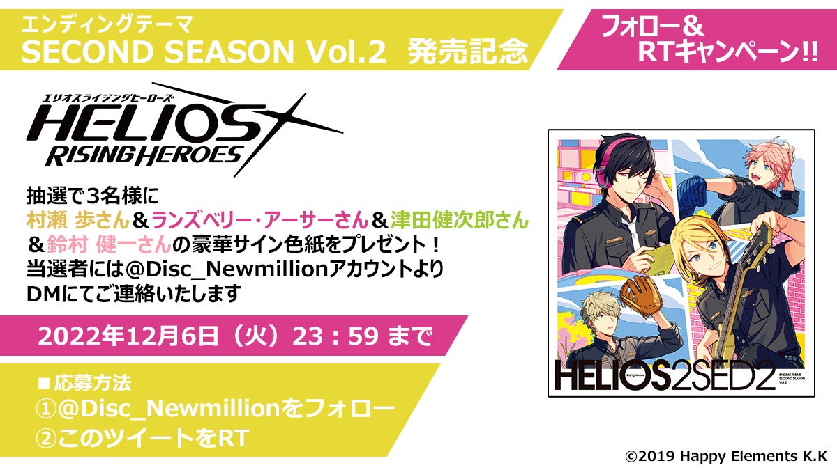 - 『HELIOS Rising Heroes』エンディングテーマ SECOND SEASON Vol.2 フォロー&RTキャンペーン開催!