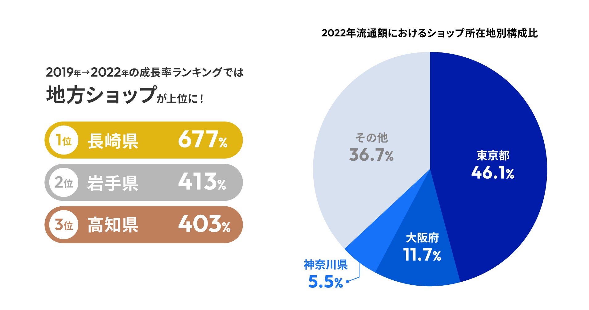 流通額を導入ショップ様の所在地別に見ると、最も多いのは東京都で全体の46%を占めています。一方、2019年と2022年の流通額を比較した成長率を見ると、1位は長崎県で677%、2位は岩手県で413%、3位は高知県で403%となっており、地方のショップ様による流通額が大きく成長いたしました。地方では、これまであまりEC化が進んでいない状況がありましたが、コロナ禍で観光業が打撃を受けたことからEC化による販路拡大を目指したことや、業務効率化のためにDX化を推進する動きが活発化したことで、導入店舗数が増加し、流通額も成長したと考えられます。