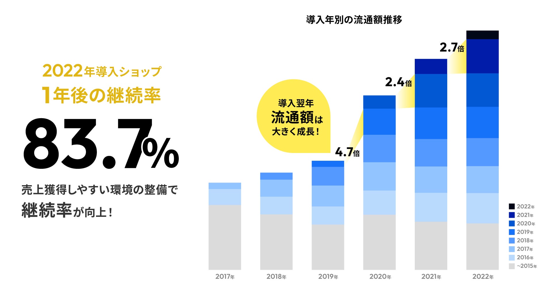 「MakeShop byGMO」の流通額を導入年別に見ると、2019年に導入されたショップ様の流通額は導入翌年の2020年に4.7倍に成長していることが分かります。同様に、2020年導入ショップ様の流通額は2021年に2.4倍、2021年に導入されたショップ様は2022年に2.7倍になり、いずれも大きく成長し、流通額の増加を牽引いたしました。