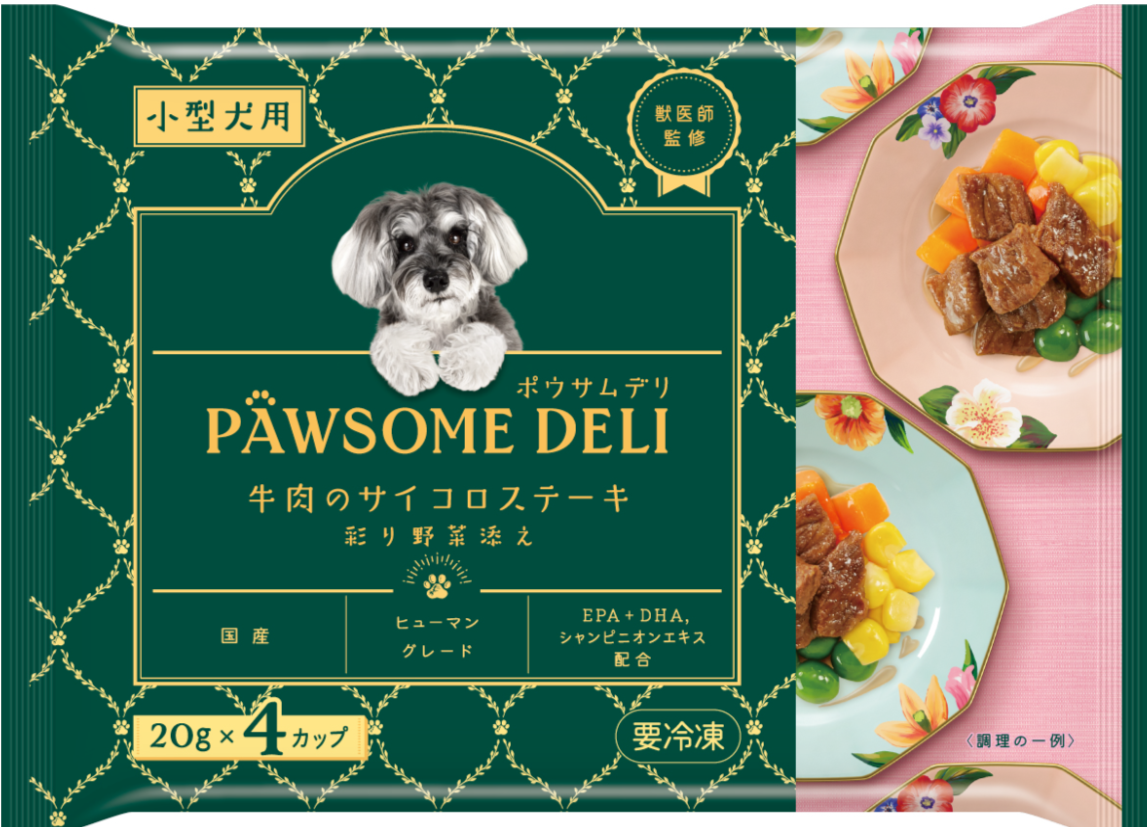「PAWSOME DELI(ポウサムデリ)」は、ニッスイの持つ冷凍食品開発や品質管理の技術を活用し、生み出されたペットフードです。獣医師による監修のもと、人間と同様の食品原料を使用し、食品工場で生産しているヒューマングレードであることが大きな特徴です。