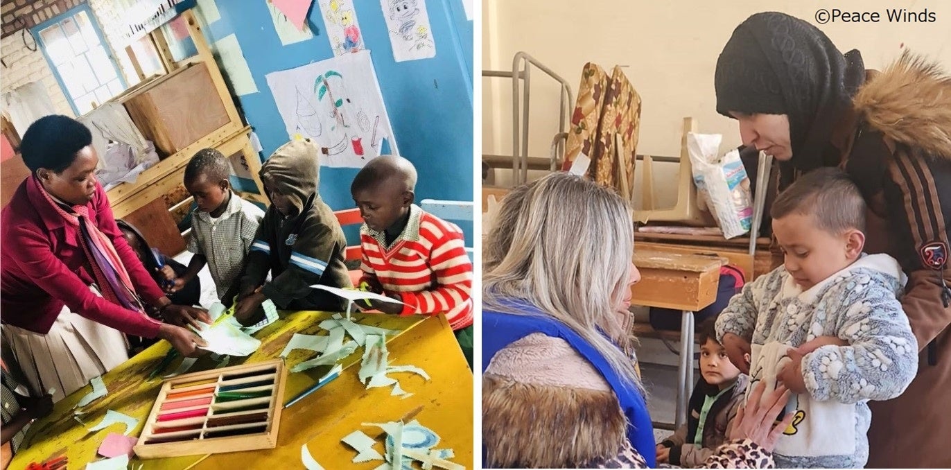 画像左:(C)ルワンダの教育を考える会 ミヨべ地区の子どもたち(ルワンダ)、画像右:(C)ピースウィンズ・ジャパン 避難場所の子どもに寄りそうスタッフ(シリア)