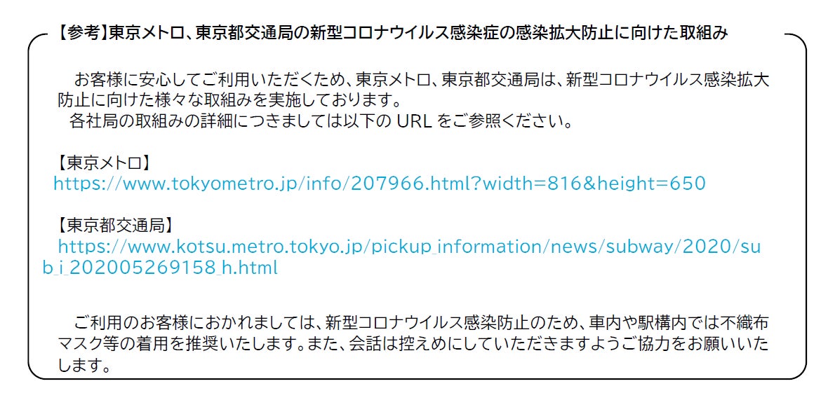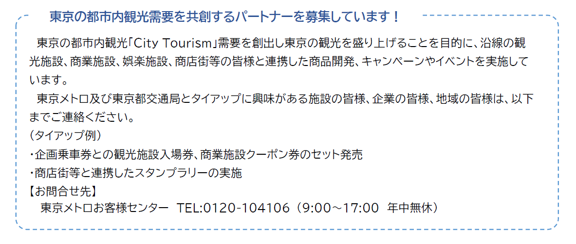 今後も、東京メトロと東京都交通局は、便利な乗車券を中心としたお得な商品の開発、発売を通して、お客様の利便性向上に繋がる取組みを展開していきます。