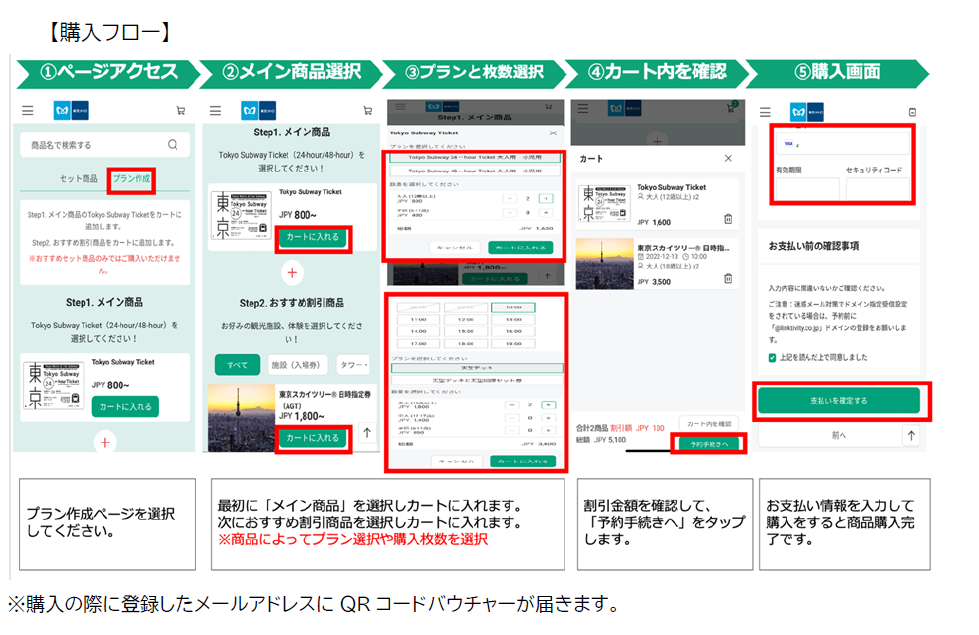 ③お好きな観光施設、体験施設を選択し、購入画面において決済を行います。決済が完了するとスマートフォン等にQRコードまたはデジタルチケットが送付されます。