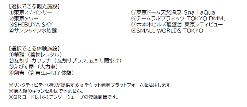 本サービスでは東京都内の12の観光施設及び体験施設から、お好みの施設、体験をお客様ご自身で選択し、自由に組み合わせてオリジナルプランを作成でき、Tokyo Subway Ticketとセットでお得にご購入いただけます。