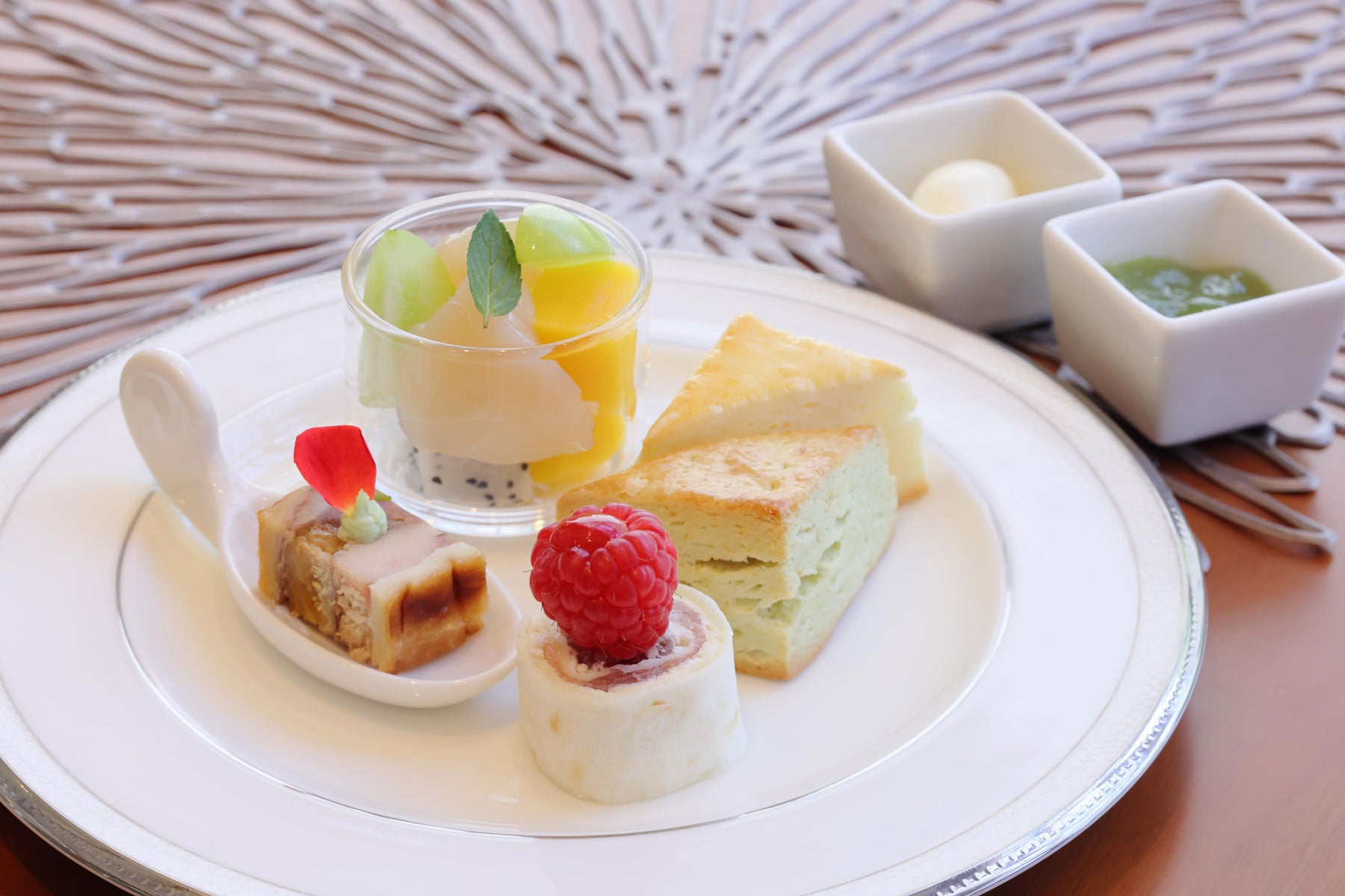 甘味・塩味・酸味が三味一体となり、デザートを一段と引き立たせるセイボリーをご用意。プレーンとマスカット風味の2種類のスコーンにはクリームとシャインマスカットジャムの相性が抜群です。帆立の旨味と果実が彩る「帆立貝のマリネと彩りフルーツサラダ」、ドライフルーツが香る「チキンパテのアンクルート」、生ハムの旨味とクリームチーズのコクが重なり合う「トルティーヤロール」など、多彩な味覚が交差する食べ応えのある一皿です。