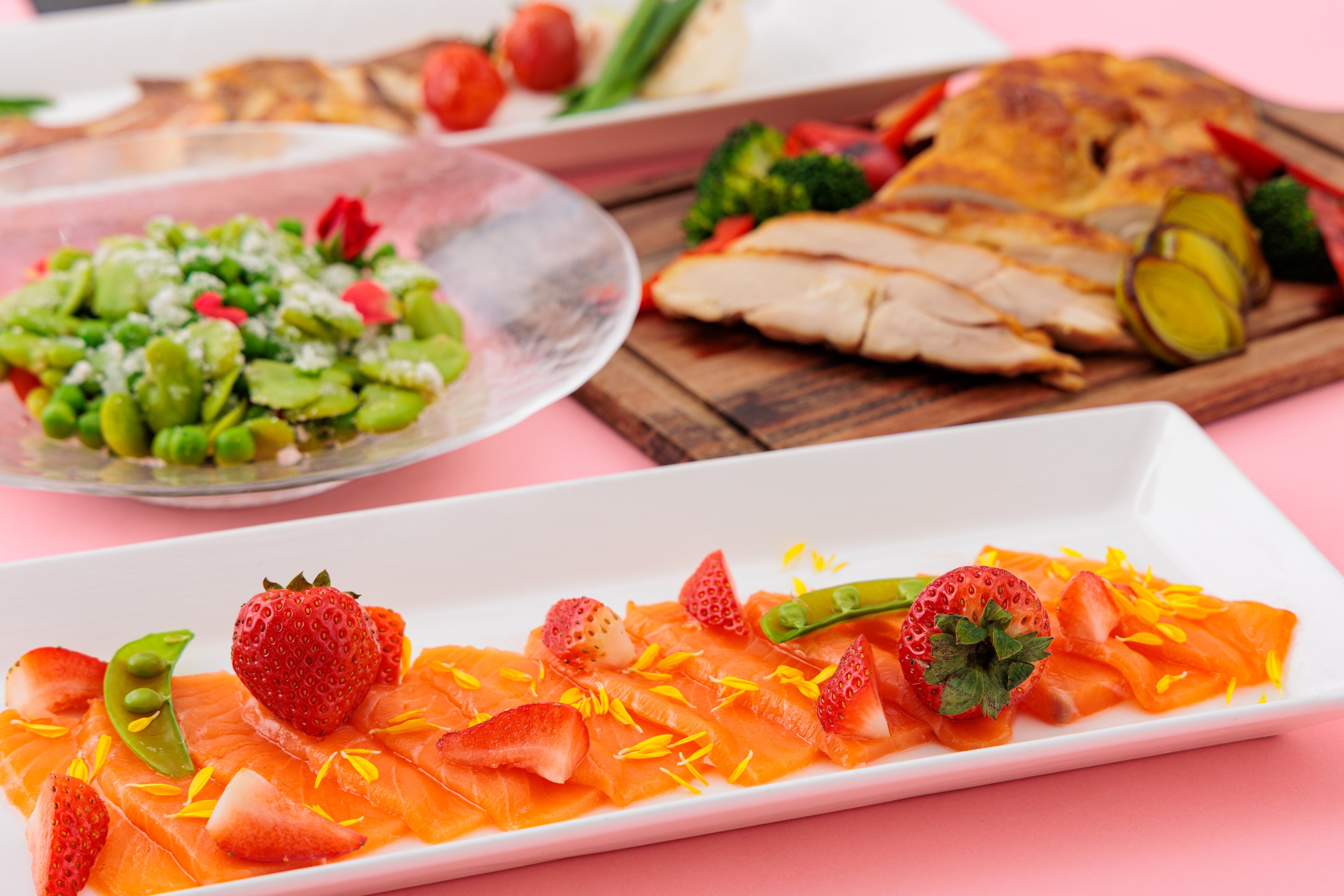ライブキッチンでは、ご注文ごとにカットする国産牛のローストビーフ、揚げたての天婦羅(旬の食材やいちご天婦羅)、握りたてのお寿司(季節の食材・いちご軍艦3種)をご用意。できたてならではの風味を目の前でお楽しみいただけます。