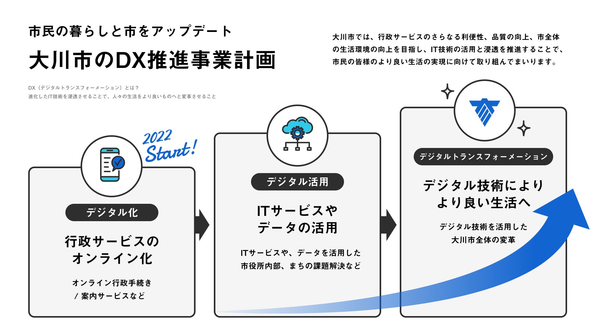 本事業は、市民の利便性や職員の業務効率を向上することを目的に、大川市とDMMが密に連携し多面的にデジタル実装をするプロジェクトです。
