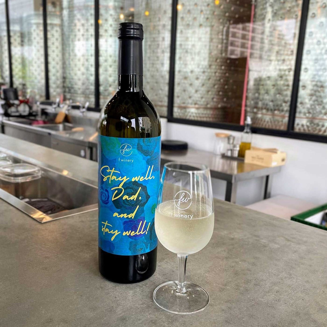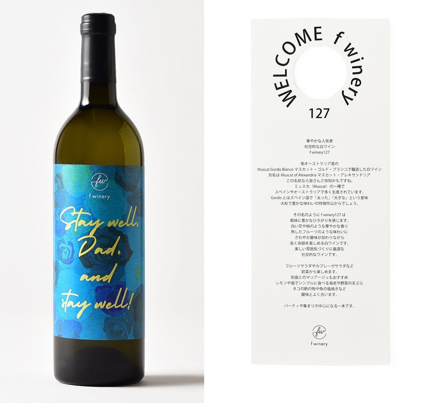 ラベルには「お父さん、いつまでもそのまま、元気でいてね!」という英文字のメッセージがデザインされています。母の日と一緒に一足早くお父さんへも一緒に贈るのも素敵です。ワインはf wineryのオリジナルワインno.127、南オーストラリア産のマスカット・ゴルド・ブランコで醸した白ワインです。白い花や桃のような華やかな香り、熟したフルーツのような味わいにさわやかな酸味が加わって、長く余韻が楽しめます。前菜からメインまで合わせやすく、感謝を伝えるパーティに華やかさを添えるギフトにふさわしい一本です。(f wineryソムリエ:中村圭緒)