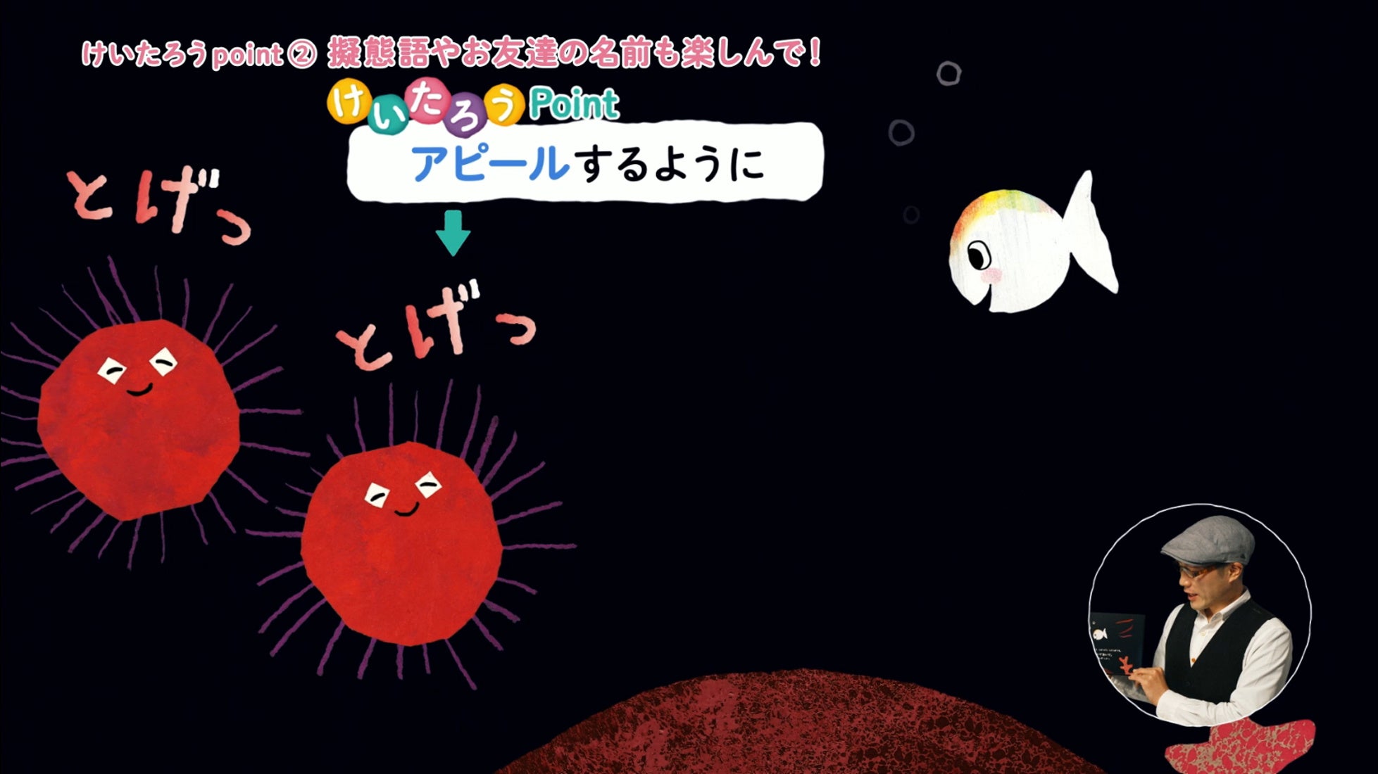 赤色をした海の仲間「とげっぴ」と「とげっぽ」が登場するシーンでは、“デカ字”で表された「とげっ」「とげっ」の読みかたについて、《アピールするように》読もう、とユニークな指導が入ります。