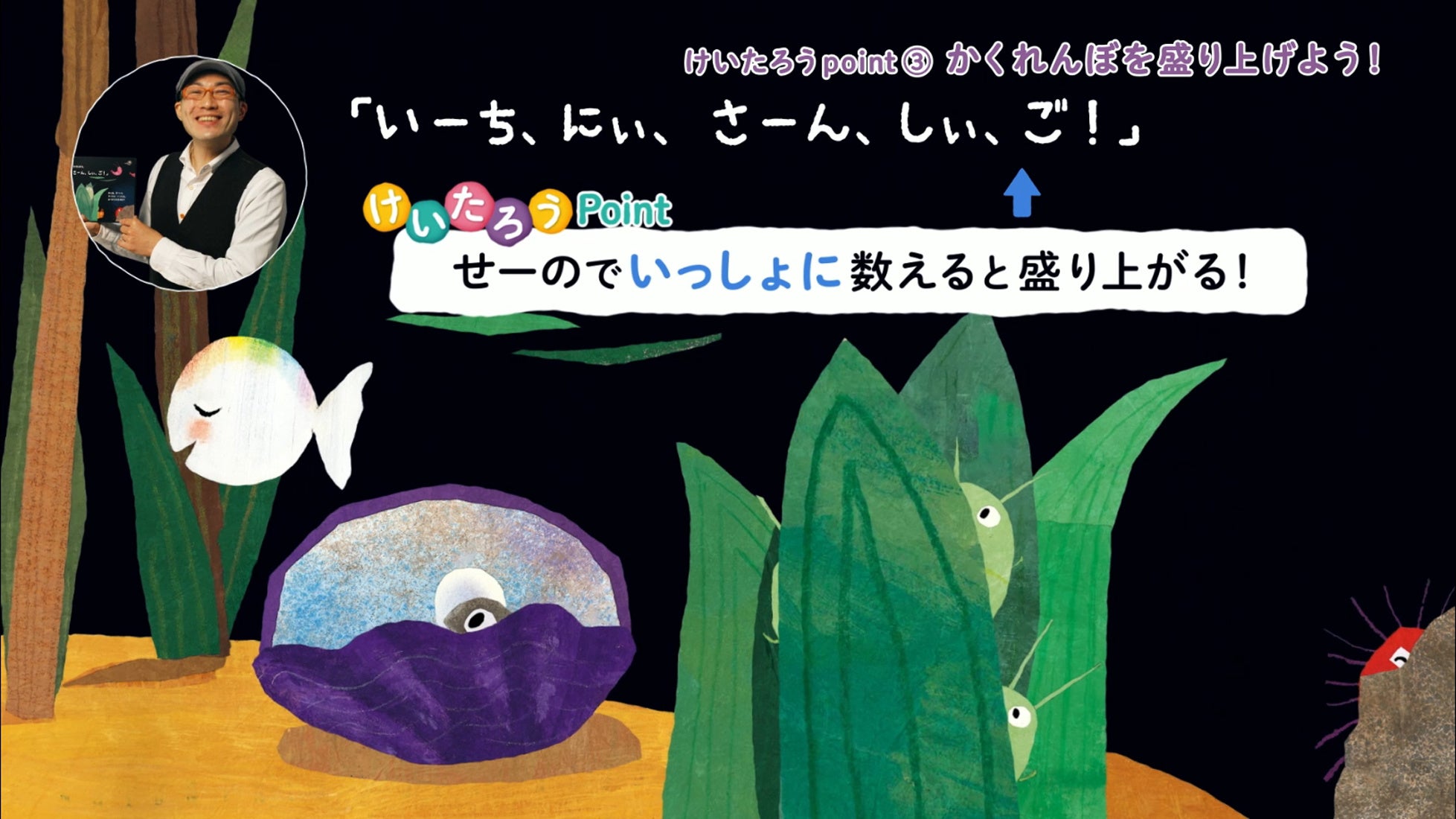 ★登場する海の仲間の数が、ページをめくるごとに1ぴき、2ひき…と順に増えていくことや、かくれんぼのシーンで「いーち、にぃ…」と数えるなど、数に注目するとおもしろいこと